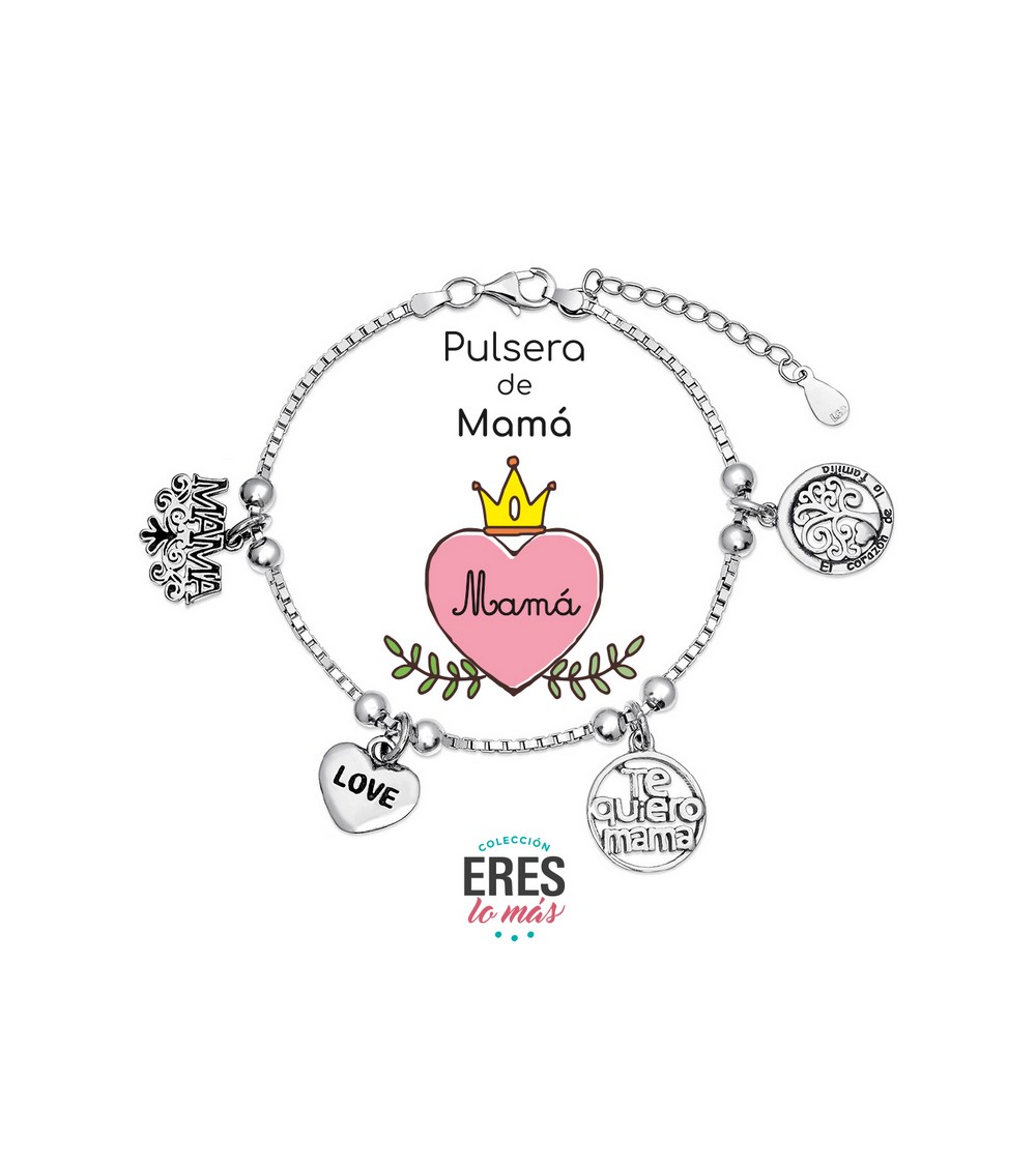 El diseño cuenta con colgantes llenos de significado: un carrito de bebé, un chupete, un corazón y una medalla central grabada con la palabra "Mamá". Es una joya diseñada para resistir el paso del tiempo, al igual que el vínculo que representa.