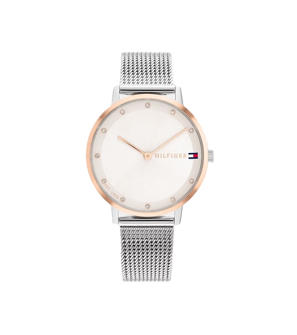 Modelo Pippa sofisticado de 34 mm. Caja de acero con baño de oro rosa y brazalete tipo malla milanesa. Esfera rosa pálido con efecto sunray.. El compromiso de Tommy Hilfiger con el detalle se refleja en cada componente; desde la precisión de su movimiento de cuarzo hasta los acabados de alta resistencia en la caja y el brazalete. Es el regalo perfecto para quienes valoran la distinción y la funcionalidad.